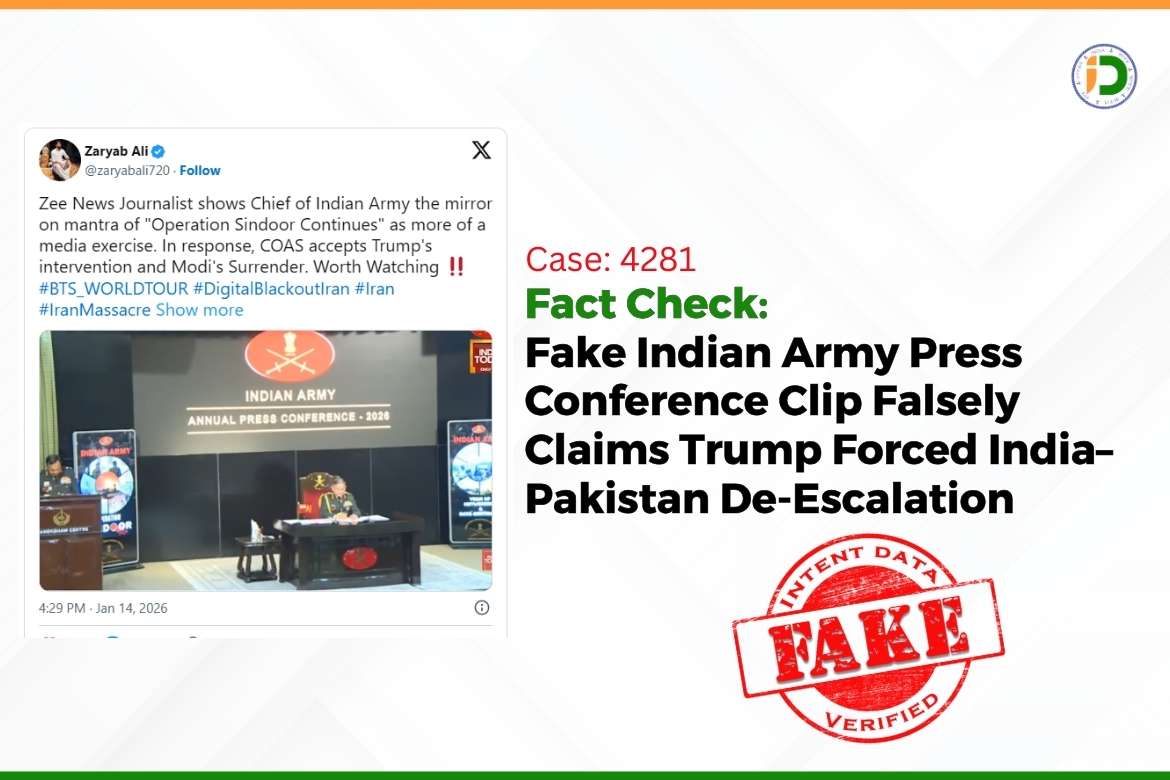 Pakistani propaganda accounts are circulating a digitally manipulated video falsely claiming it is from the Indian Army’s Annual Press Conference 2026. In the altered clip, a journalist allegedly introduces himself as Anurag Sharma from Zee Media and asks provocative questions. The video then attributes a fabricated response to Indian Army Chief General Upendra Dwivedi, falsely suggesting that U.S. President Donald Trump intervened in May 2025 to de-escalate the India–Pakistan conflict and that India suffered a diplomatic setback. This claim is entirely false and fabricated.